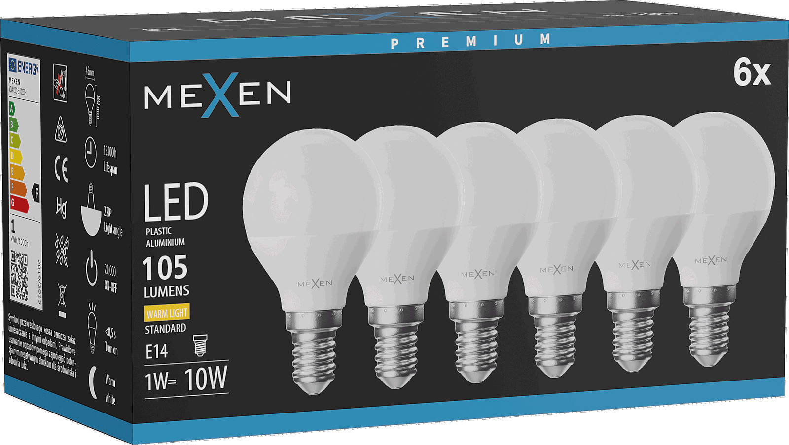 Mexen Nova 6x LED-lamp E14, G45, 1W, Warm - 3000K, 105 lm - L101-E14-0130-01x06