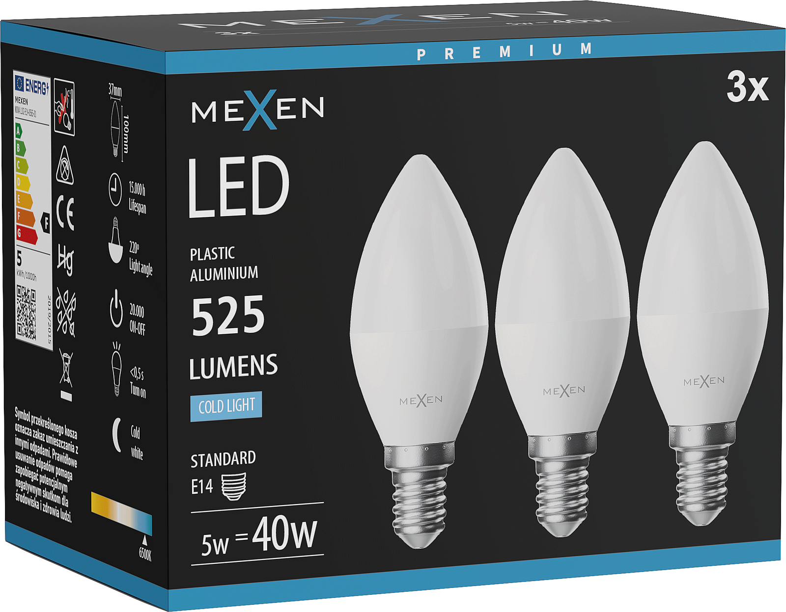 Mexen Nova 3x LED-lamp E14, C37, 5W, Koud - 6500K, 525 lm - L102-E14-0565-01x03