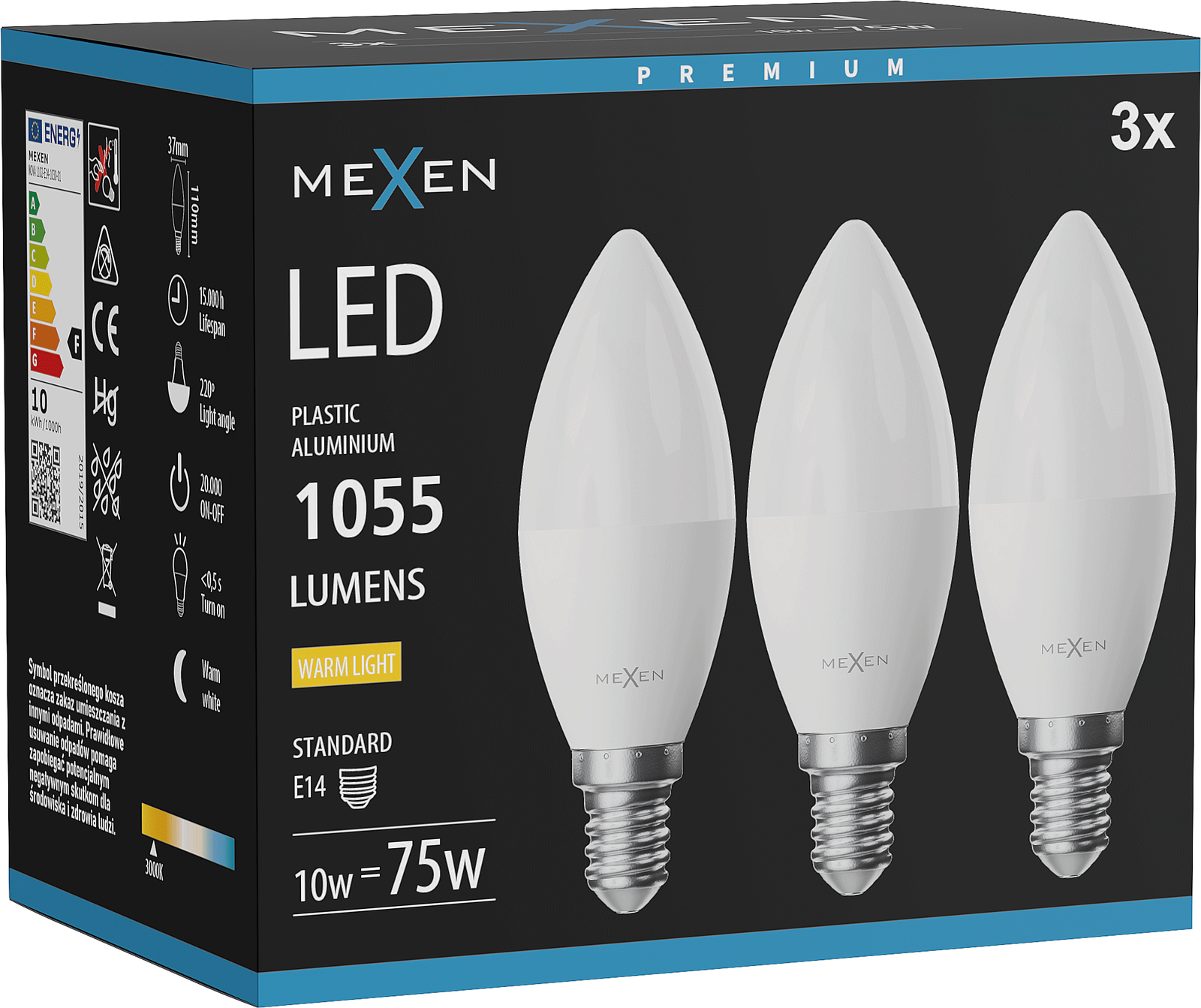 Mexen Nova 3x LED-lamp E14, C37, 10W, Warm - 3000K, 1055 lm - L102-E14-1030-01x03