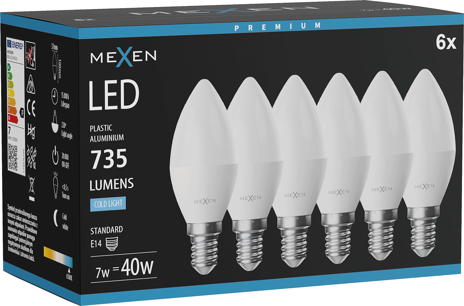 Mexen Nova 6x LED Lamp E14, C37, 7W, Koud - 6500K, 735 lm - L102-E14-0765-01x06