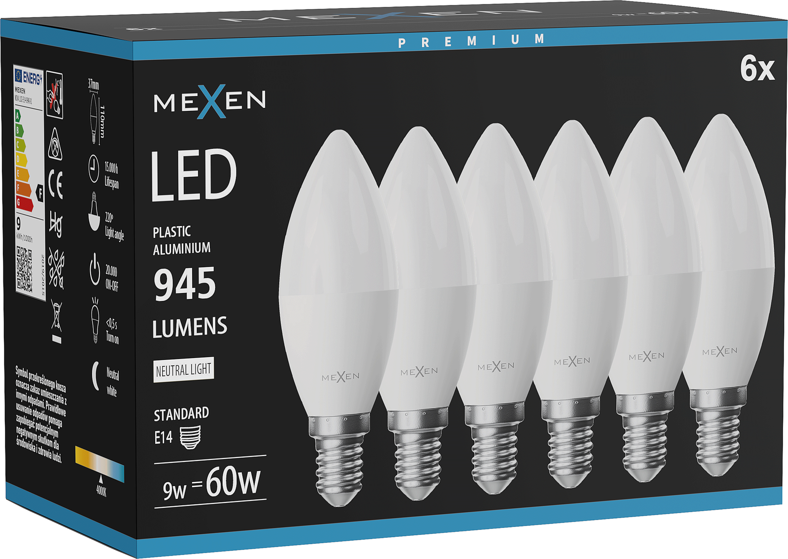 Mexen Nova 6x LED-lamp E14, C37, 9W, Neutraal - 4000K, 945 lm - L102-E14-0940-01x06