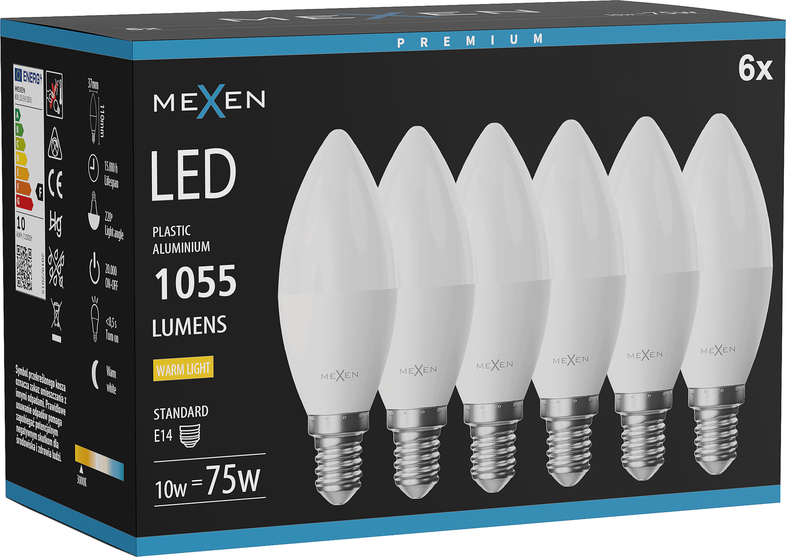 Mexen Nova 6x LED-lamp E14, C37, 10W, Warm - 3000K, 1055 lm - L102-E14-1030-01x06