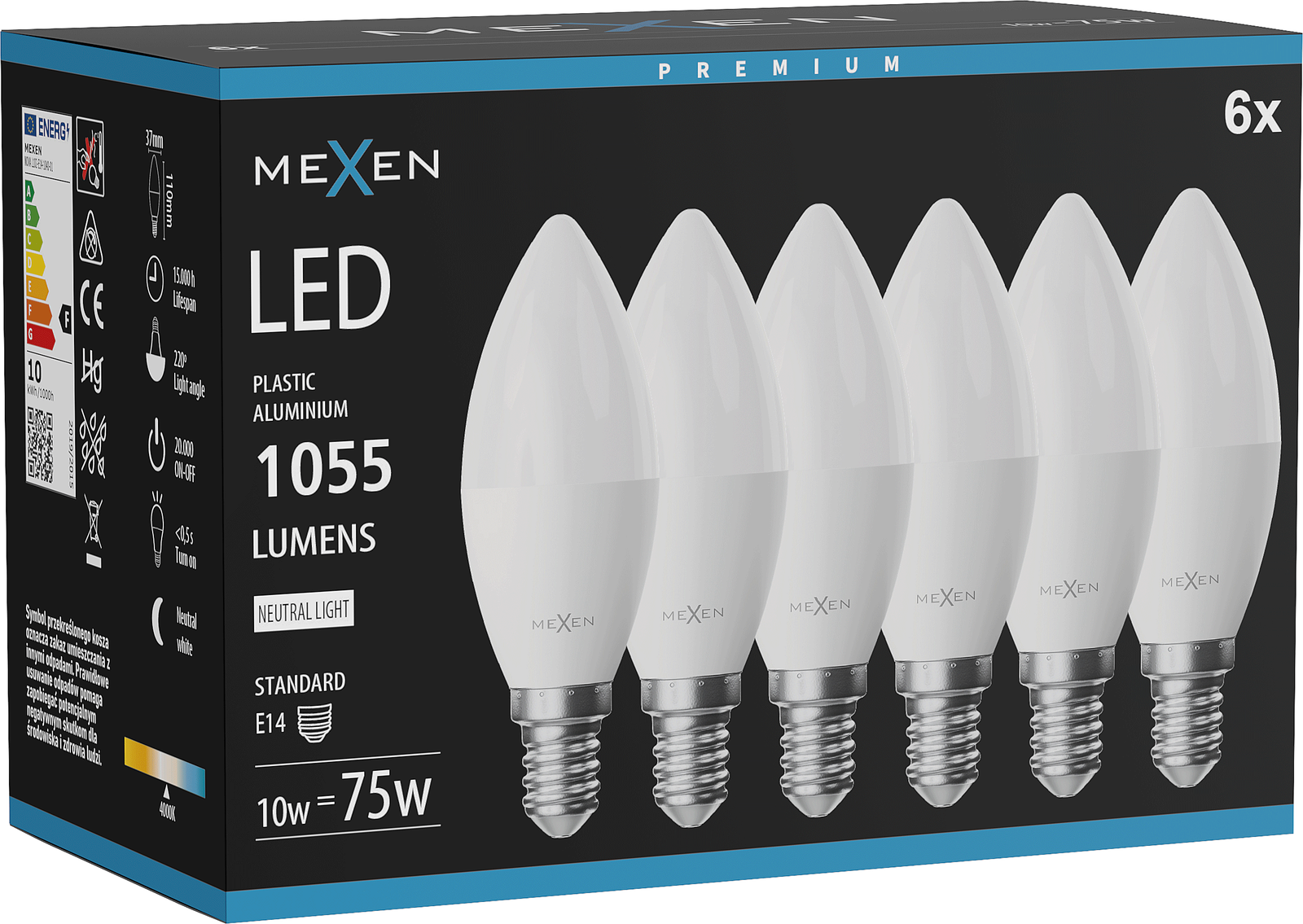 Mexen Nova 6x LED-lamp E14, C37, 10W, Neutraal - 4000K, 1055 lm - L102-E14-1040-01x06
