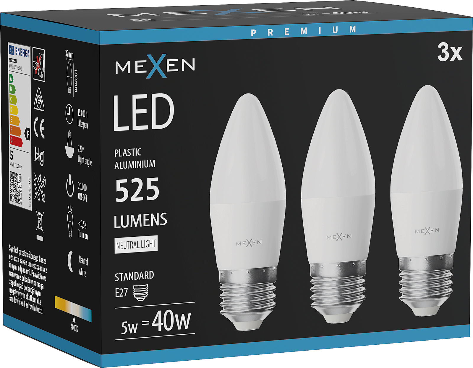 Mexen Nova 3x LED-lamp E27, C37, 5W, Neutraal - 4000K, 525 lm - L102-E27-0540-01x03
