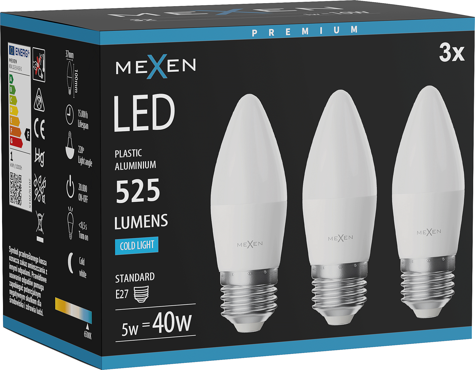 Mexen Nova 3x LED-lamp E27, C37, 5W, Koud - 6500K, 525 lm - L102-E27-0565-01x03