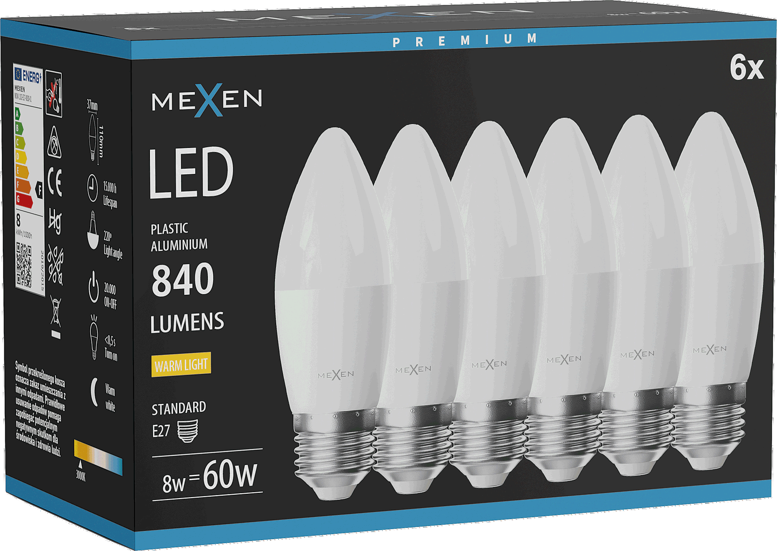 Mexen Nova 6x LED-lamp E27, C37, 8W, Warm - 3000K, 840 lm - L102-E27-0830-01x06