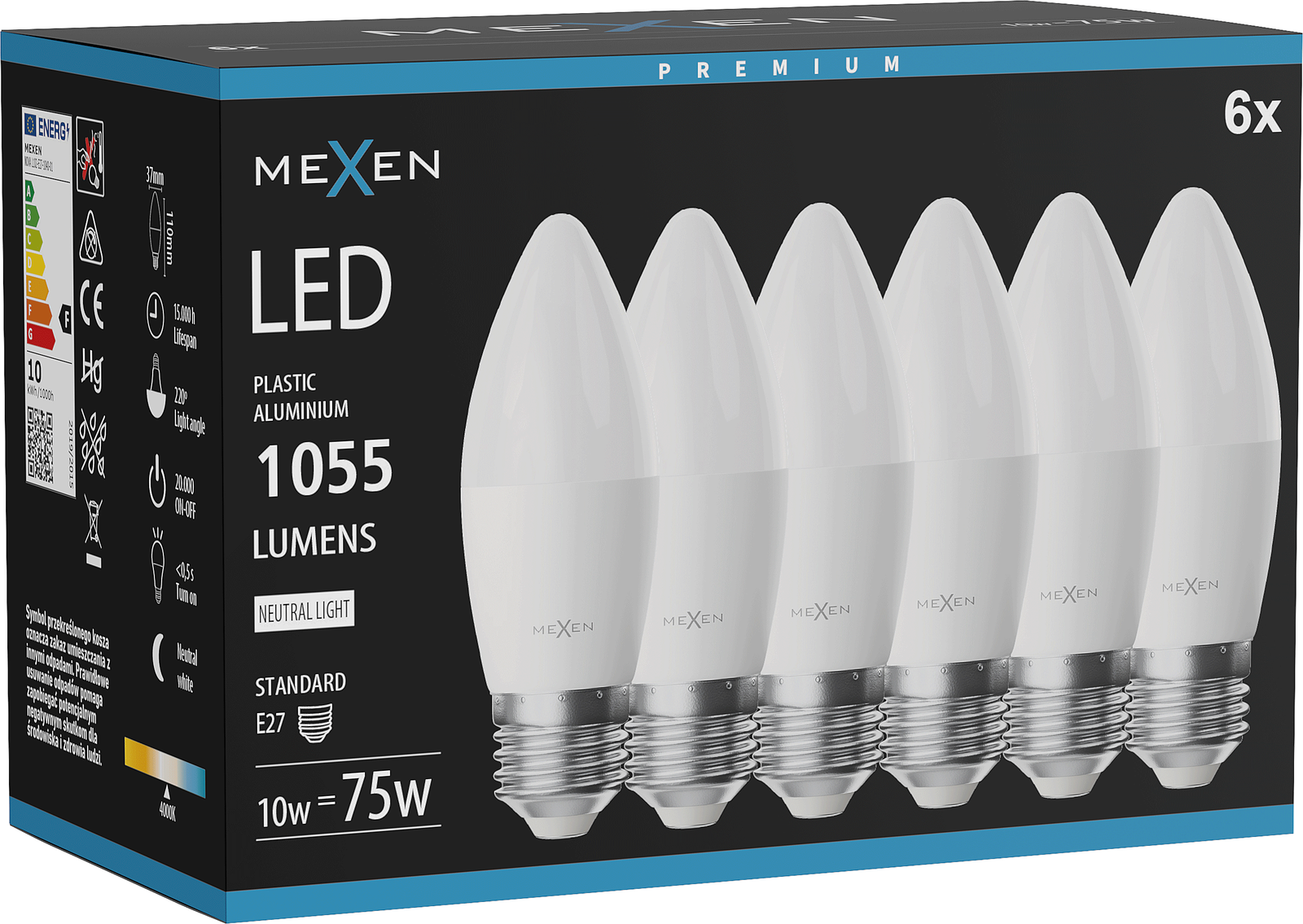 Mexen Nova 6x LED-lamp E27, C37, 10W, Neutraal - 4000K, 1055 lm - L102-E27-1040-01x06