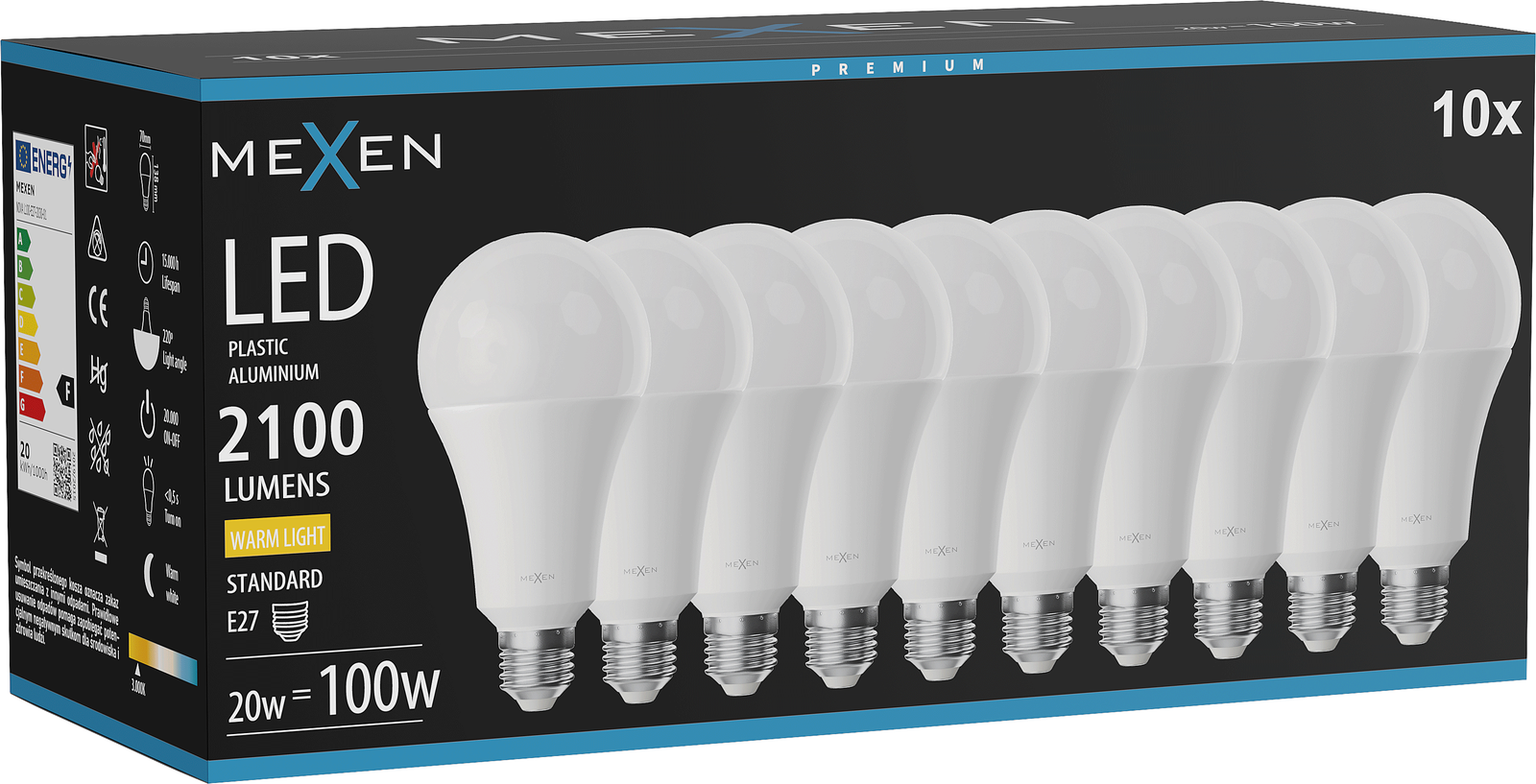 Mexen Nova 10x LED-lamp E27, A70, 20W, Warm - 3000K, 2100 lm - L100-E27-2030-01x10