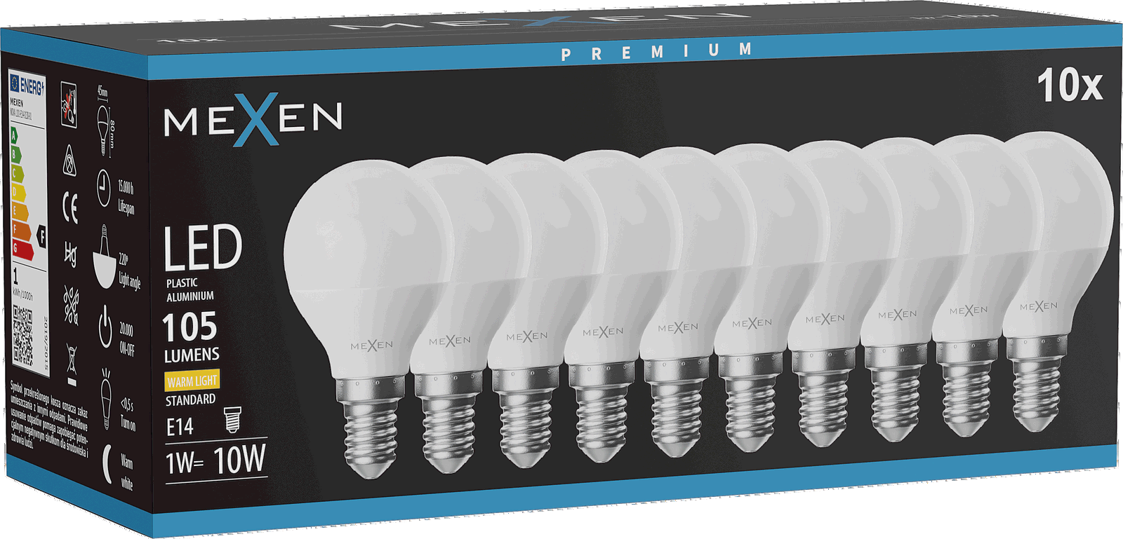 Mexen Nova 10x LED-gloeilamp E14, G45, 1W, Warm - 3000K, 105 lm - L101-E14-0130-01x10