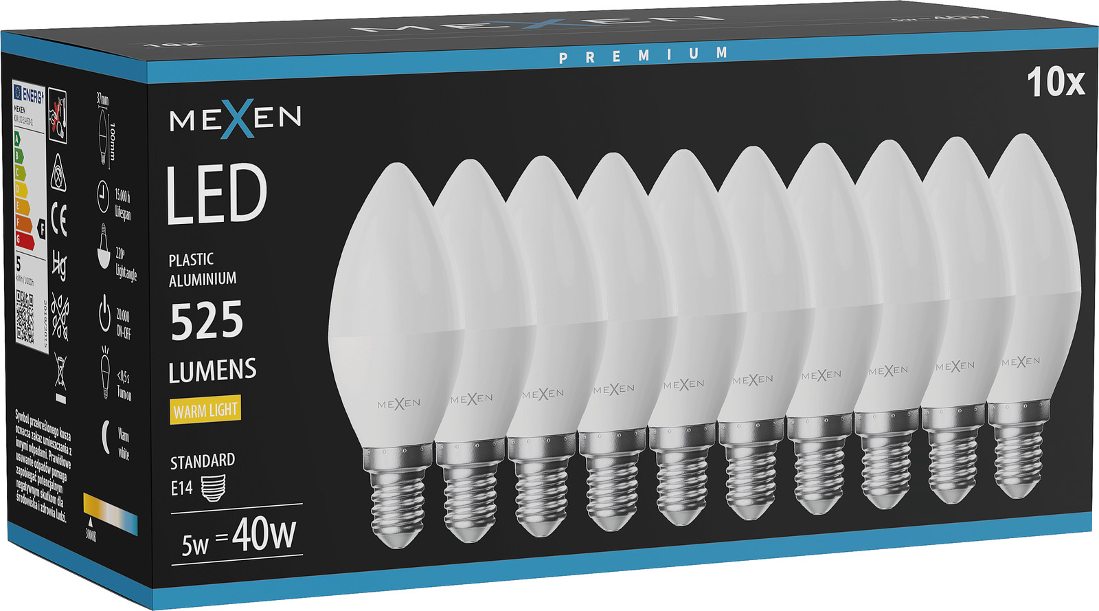 Mexen Nova 10x LED-lamp E14, C37, 5W, Warm - 3000K, 525 lm - L102-E14-0530-01x10