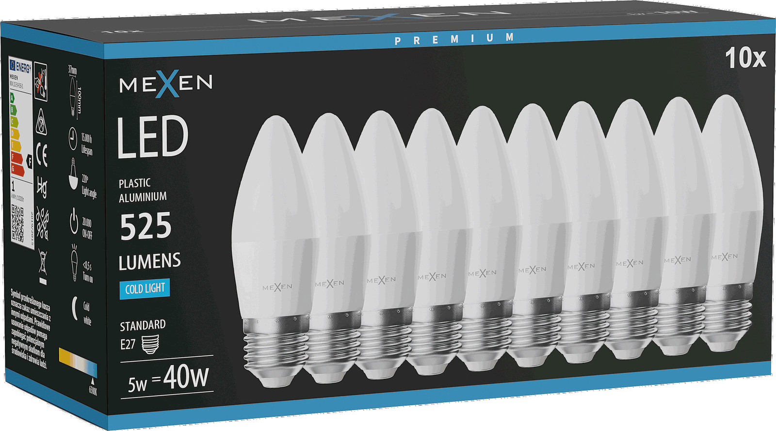 Mexen Nova 10x LED-lamp E27, C37, 5W, Koud - 6500K, 525 lm - L102-E27-0565-01x10