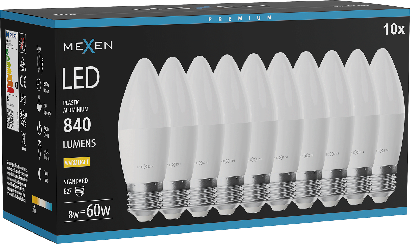 Mexen Nova 10x LED-lamp E27, C37, 8W, Warm - 3000K, 840 lm - L102-E27-0830-01x10