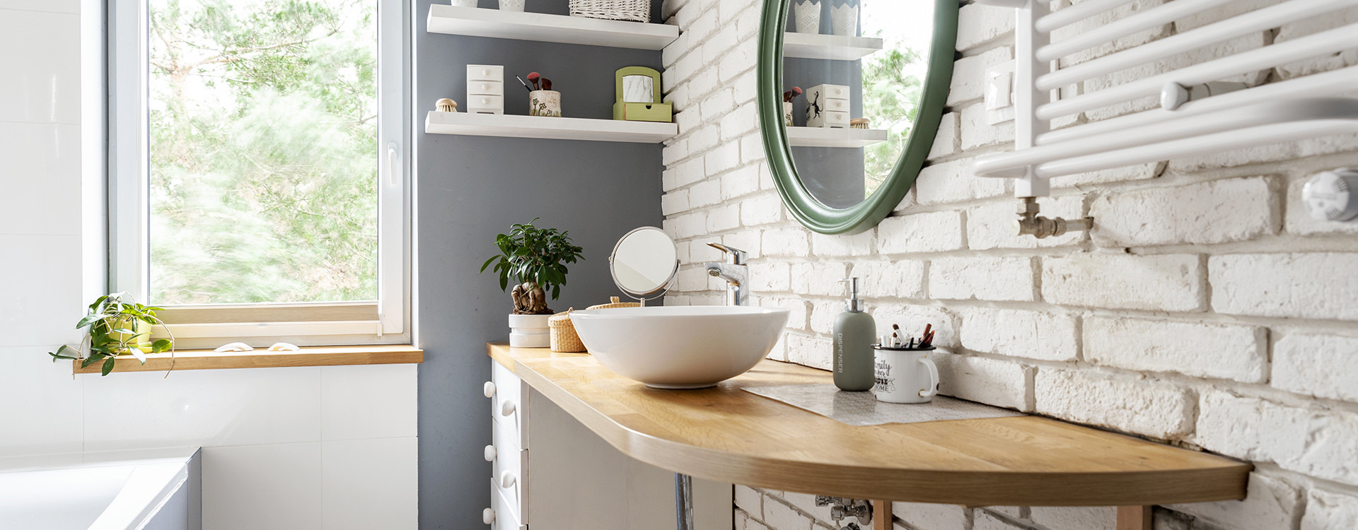 Een andere manier om onze Scandinavische badkamer te onderstrepen is baksteen – ruw of gebleekt. Dit element kan ook worden bereikt met imitatie die door keramische tegels in deze vorm worden aangeboden.